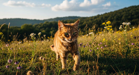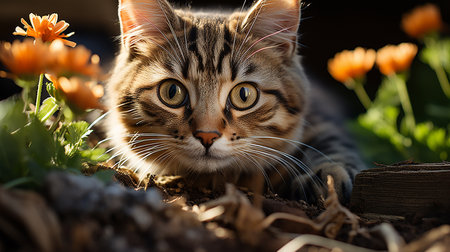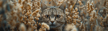 Immerse yourself in the tranquility of this close-up capture, where a feline enigma hides amidst golden wheat fields Its delicate ears blend seamlessly into the rustic autumnal landscape, creating a scene of serene camouflage Feel the peace and serenity as the cat's presence whispers secrets amidst the rustling wheat, inviting you to embrace the beauty of nature's hidden wonders AI Generative
