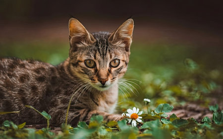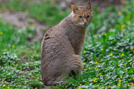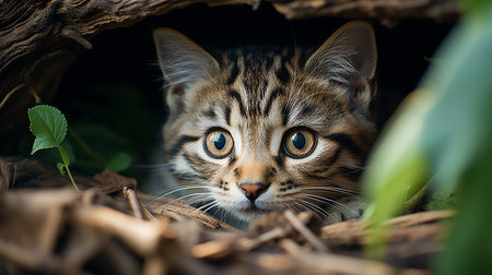 Kitten crouched in the undergrowth. Feline lying down and on the prowl looking suspiciously and cautiously at the photographer's camera in a forest near the city at sunrise
