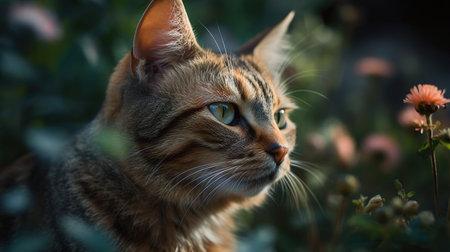Tabby cat lying by the fence, looking into the distance. The cat is irradiated with rays of light. He looks calm, but has pricked ears