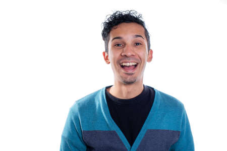 Portrait of smiling latin man with open mouth. Isolated on white background.