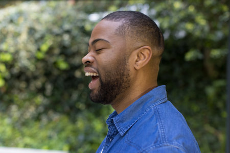 African American man laughing in profile in garden wearing denim shirt nose stud, copy space. Natural, candid, vibrant, relaxed, outdoor, joyful, casual