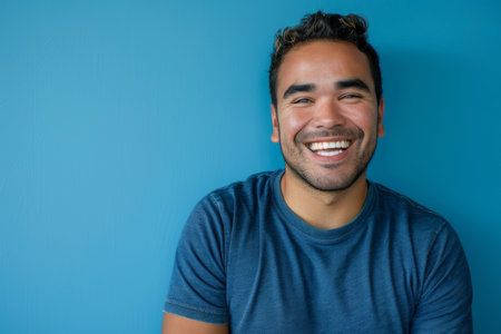 a Hispanic man in a blue sports jersey, expressing contentment with a relaxed smile on a blue studio background
