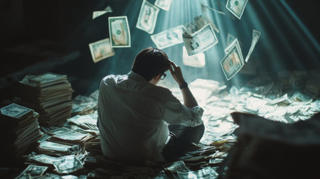 A man sitting on the floor in a dark room, surrounded by falling money, symbolizing financial stress, wealth, and the overwhelming nature of money management.