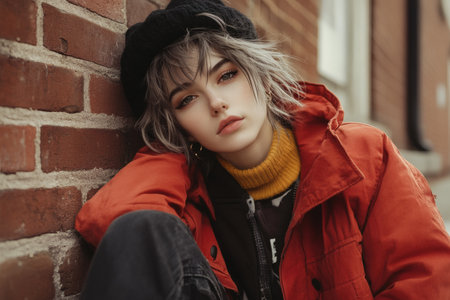 A young person with stylish gray hair sits against a brick wall, wearing a bright orange jacket and black beanie, looking thoughtfully into the distance as autumn light casts a warm glow.