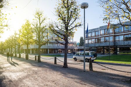 Karlsruhe, Germany - Oct 29 2017: Pedestrians walking in front of Police van surveilling Federal Constitutional Court building Bundesverfassungsgericht the supreme court for of Germany