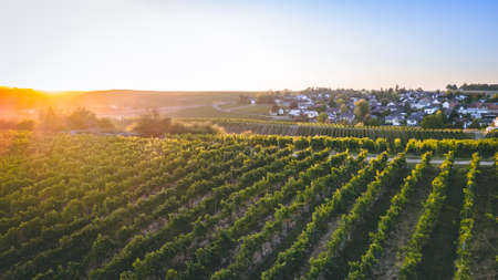 Lush vineyard rows at sunset, overlooking a charming town nestled amidst rolling hills