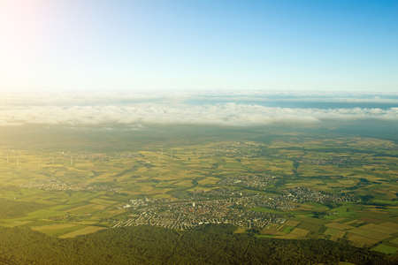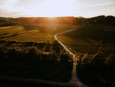 Aerial view from drone. Aerial view amazing sunset over of the suburbs with the city, far villages and fields