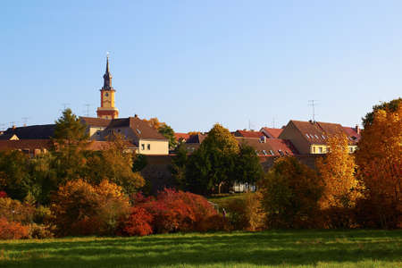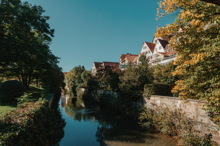 Beautiful small river with clean and clear water front of colorful autumn trees and small old town on the hill agaist nice blue and clouds sky during autumn in Europe