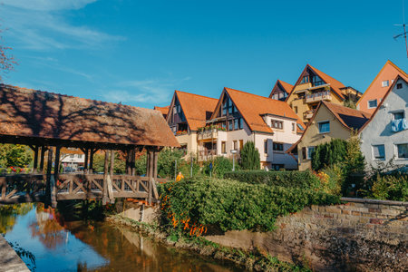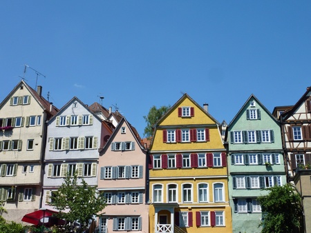 Half timbered houses in pastel colors at the Necktar in Tuebingen in Germany