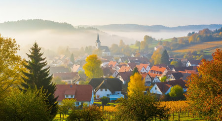 Vibrant autumn foliage lines a vineyard path leading towards charming countryside cottages. the tranquil setting, enhanced by misty hills and a serene river, essence of fall's warm hues and rustic charm. Generative AI