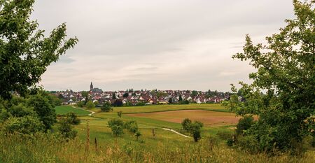 Panorama of the city of Bavaria, Germany. A town in the valley. View of the red roof and church towers. Gravel path next to the fields. Fields and pastures.