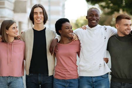 Group of close friends. Diverse team of happy cheerful sociable outgoing black and Caucasian young people in their 20s twenties in casual style clothes standing together against light grey background