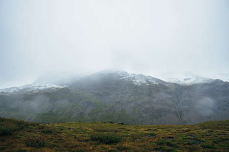 Minimalist alpine landscape with snow-capped mountains in overcast weather in rain. Deep gorge on background of snowbound mountain range under low cloudy sky. Atmospheric minimalism in high mountains.