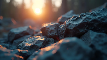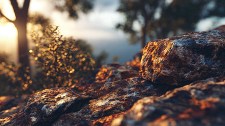 Close-up view of textured rocks illuminated by sunlight with a serene forest background, creating a tranquil and natural atmosphere perfect for outdoor themes.
