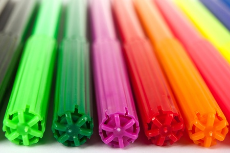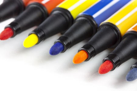 Colored markers on a white background, close-up, macro