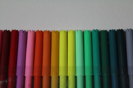 Bright colors of markers lined up on a table surface