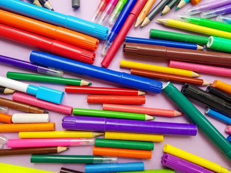 Scattered pencils and markers on a purple background. School supplies. Back to school. High quality photo