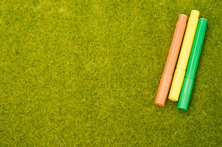 A closeup shot of markers on the green grass background