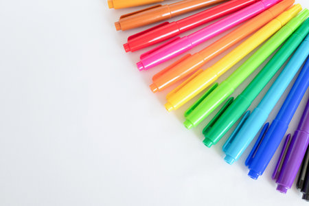 A vibrant collection of colorful writing instruments displayed on a clean surface. Perfect for creative projects, artistic endeavors, and office use.