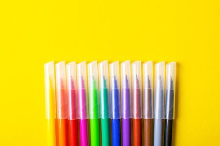 Colorful felt-tip pens or markers for drawing on bright yellow background.