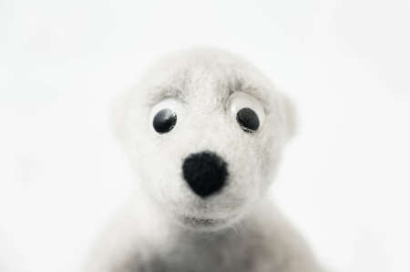 portrait of toy polar bear made of felted wool on white background