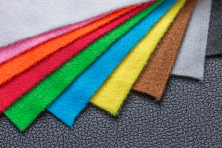 Samples of felt in different colors on black faux leather background