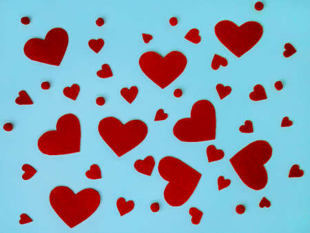 Red hearts on a blue background. Festive background for your projects. Symbol of love