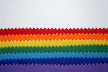 Set of colorful rainbow felt samples, multicolor, bright, closeup on white background with copy space