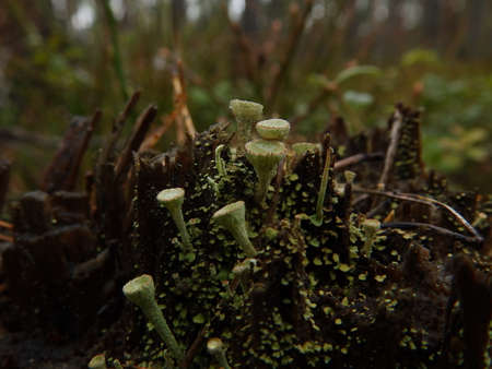 beautiful lichen with the Latin name Cladonia foliacea, folk name goblets of the elves, grows on old stumps, forest of the southern Urals