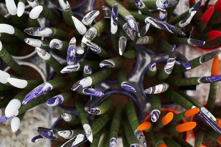 Exotic succulent flowers in a flower shop. Potted house plants, close-up. Farming and Gardening concept. Colorful cactus flowers grow in greenhouse