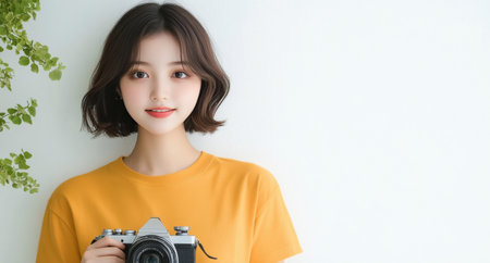A girl with short hair is smiling brightly while holding a camera. She appears joyful and engaged, showcasing her enthusiasm for photography. The background is light and neutral.
