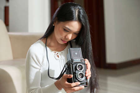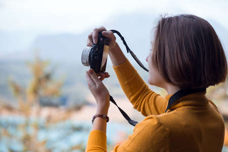 Beautiful asian thai woman traveler taking photo with vintage camera outdoors.