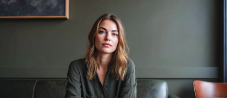 A young woman sits on a sofa in a room with green walls, looking straight ahead. The light is soft, creating a nice ambiance. It is afternoon, and she appears deep in thought.