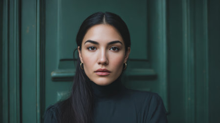 A woman stands against a green wall with a serious expression on her face. Her long hair is styled neatly. The background adds a simple touch to her appearance.