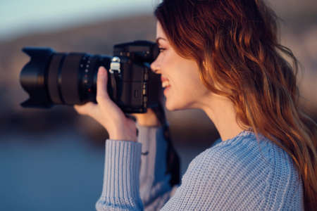 Beautiful woman with red hair holds modern camera in her hands. Gray background, creativity, photographer, beautiful