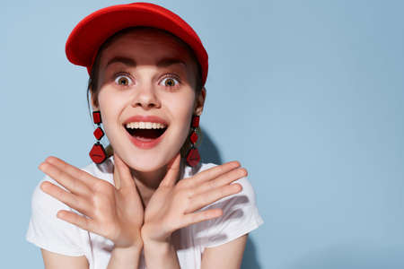 cheerful girl in a red cap makeup fashion Glamor blue background