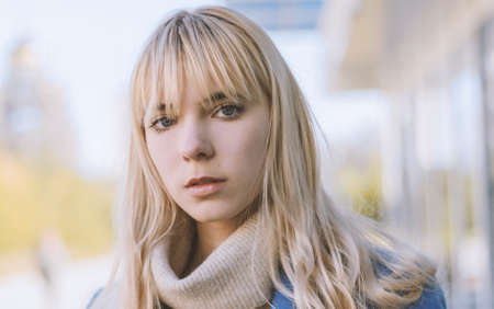 A close-up portrait of a young woman with short blonde hair, wearing a stylish coat, looking directly at the camera with a neutral expression, soft lighting, minimalistic background