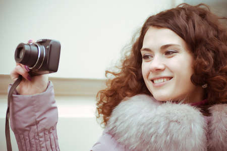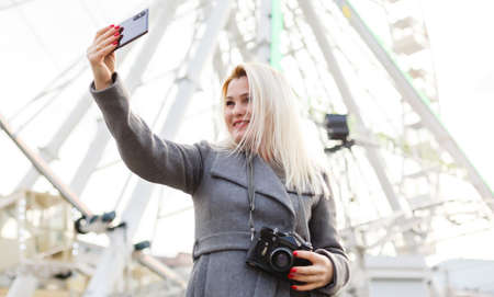 Young attractive female tourist takes selfie portrait on retro camera outdoors