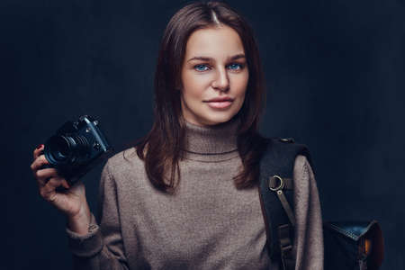 beautiful young caucasian female holding retro camera, smiling, watching at camera, eye contact