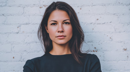 A woman stands confidently with her arms crossed in front of a white brick wall. The setting is outdoors, and the sun is shining. She shows a relaxed expression and a casual style.