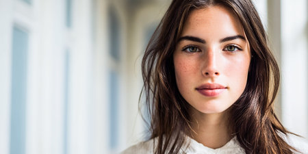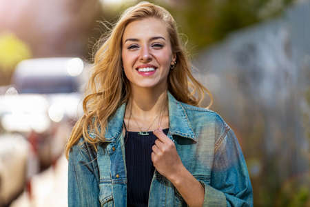 Young pretty woman with long and thick brown wavy hair and natural makeup looking at camera while standing in the street