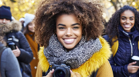 Portrait of a beautiful african american woman with curly hair, holding a camera and smiling while standing in the autumn park