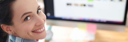 A beautiful girl in a brown blouse smiles cheerfully at the camera and plays with her wavy hair, a portrait of a young actress. soft focus background