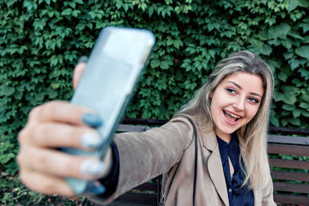 A beautiful girl takes a selfie in the Park against the background of green plants.