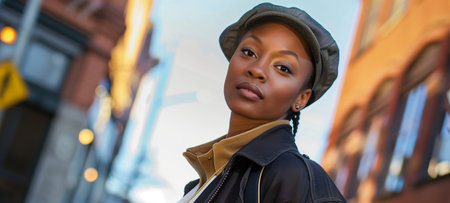 Close-up of African-American woman in a stylish cap and jacket, posing confidently in the city