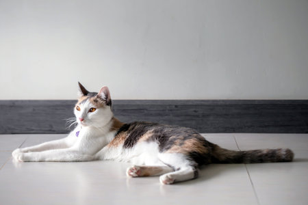 Beautiful cat sitting on the wooden floor and looking at the camera