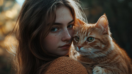 woman petting a cat on her lap. blur bokeh dept of field. Love your pet day concept. AI Generative
