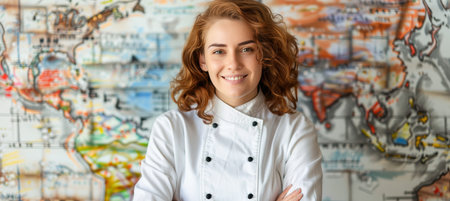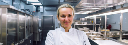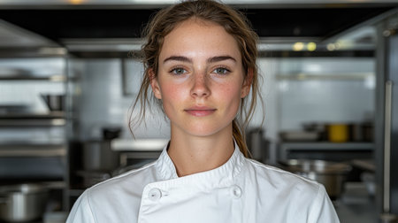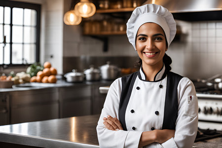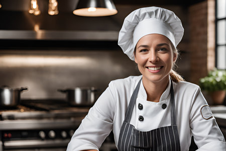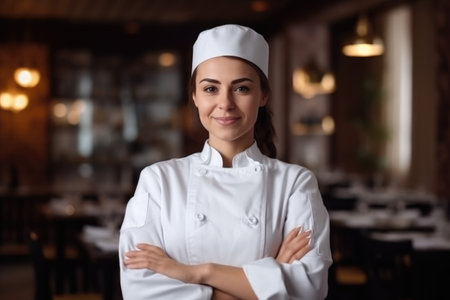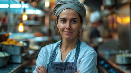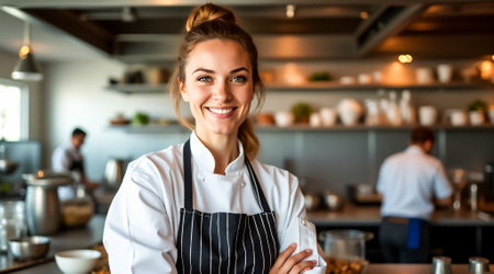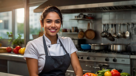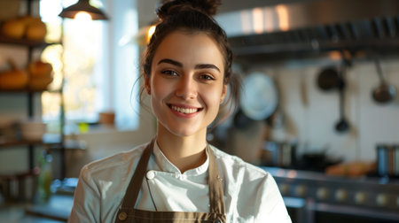 Confident woman chef with a warm smile wearing an apron standing in a professional kitchen