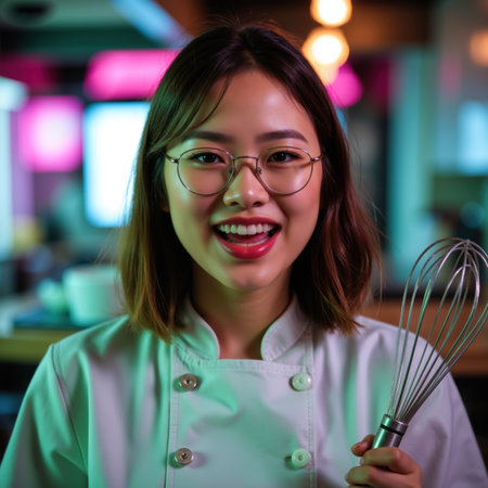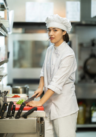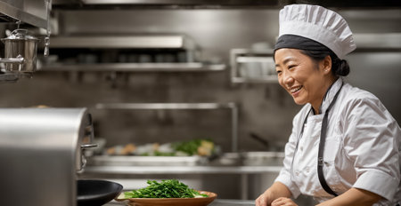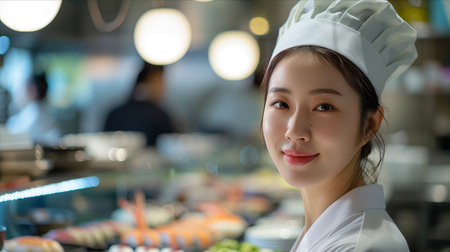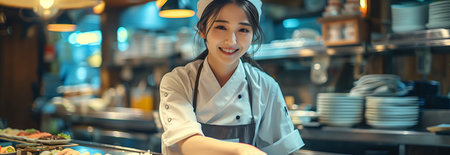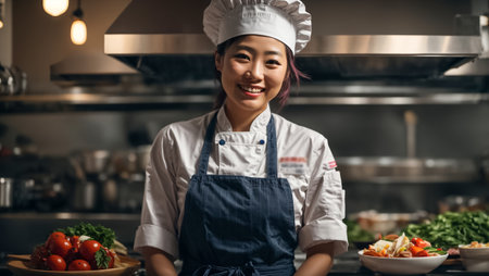 Restaurant scene with a young Asian woman chef, showcasing her culinary skills and dedication.