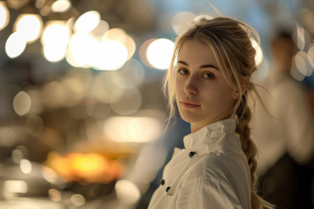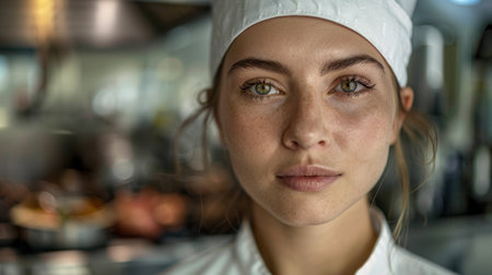 Focused female chef in a white uniform and hat, gazing thoughtfully in a professional kitchen with soft lighting and a modern atmosphere